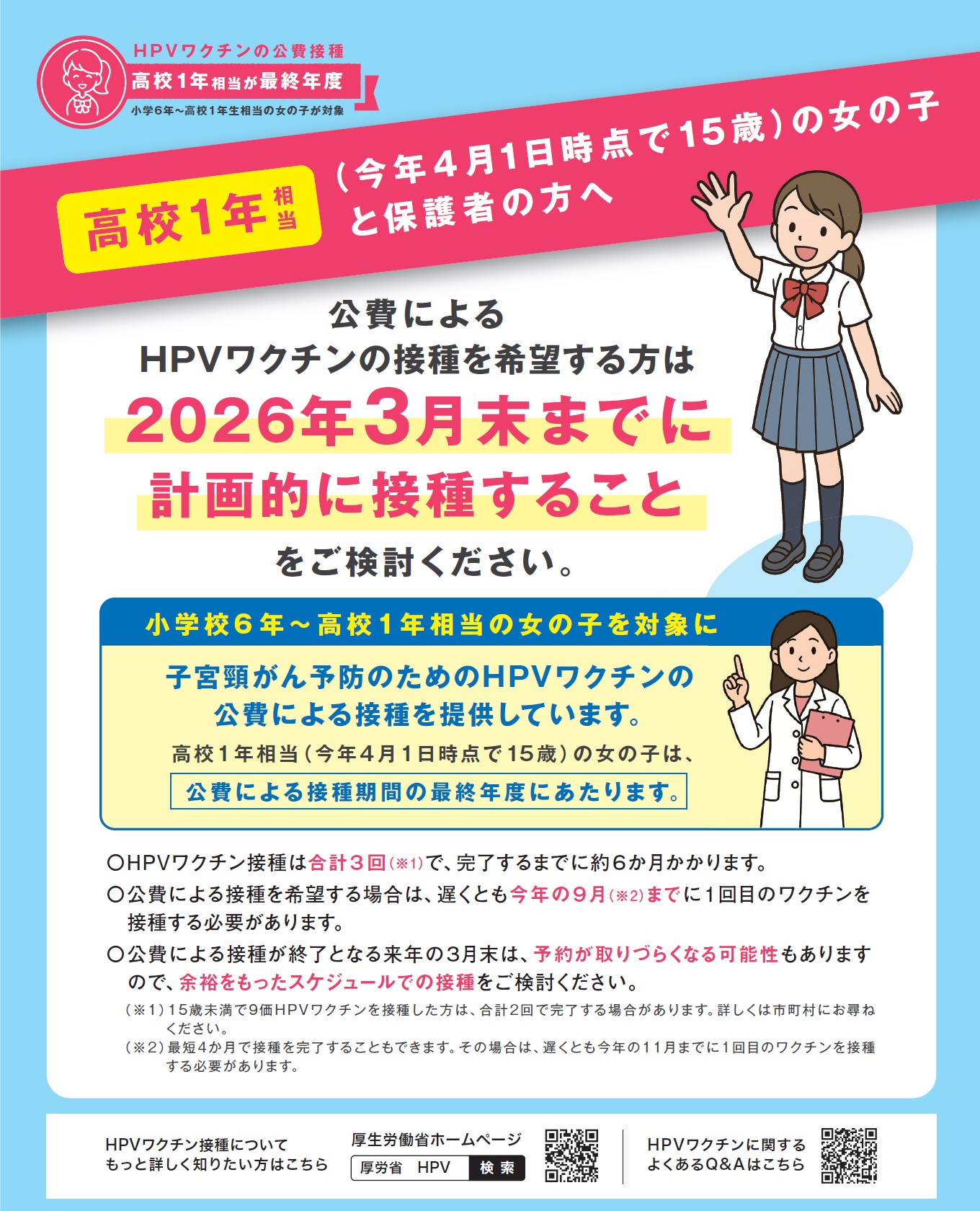 現時点で高校1年生相当(15歳~16歳)の女子の皆さん、余裕を持って、計画的にHPVワクチンを接種してください。そして、自分自身を子宮頸がんから守ってください!