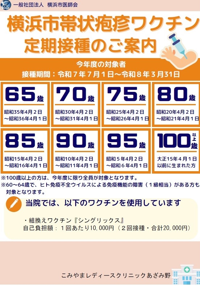 当院では帯状疱疹ワクチンの公費助成による定期予防接種を行っています。対象は横浜市内に在住の65歳以上(一部は60歳以上)の方で、横浜市より定期接種の案内状(個別通知)が届いた方です。